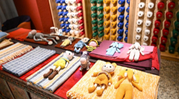 这是在西藏日喀则市一间门店拍摄的玩偶、围巾、披肩等江孜氆氇产品(9月1日摄)。