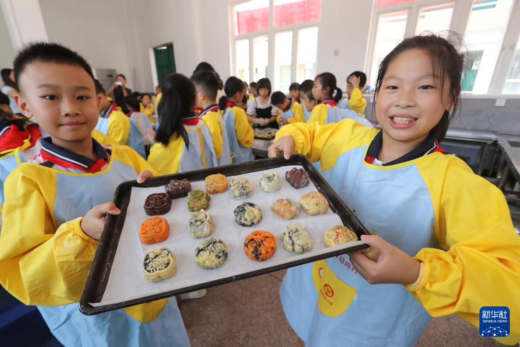 9月12日,福建省南平市顺昌县实验小学思贤校区的学生展示在家长指导下制做的月饼。