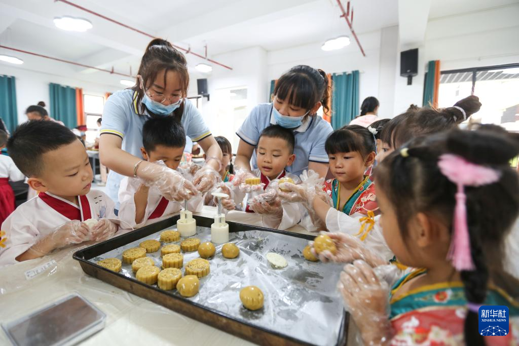 9月12日,贵州省黔南布依族苗族自治州都匀市青云湖幼儿园的老师和孩子们一起制作月饼。