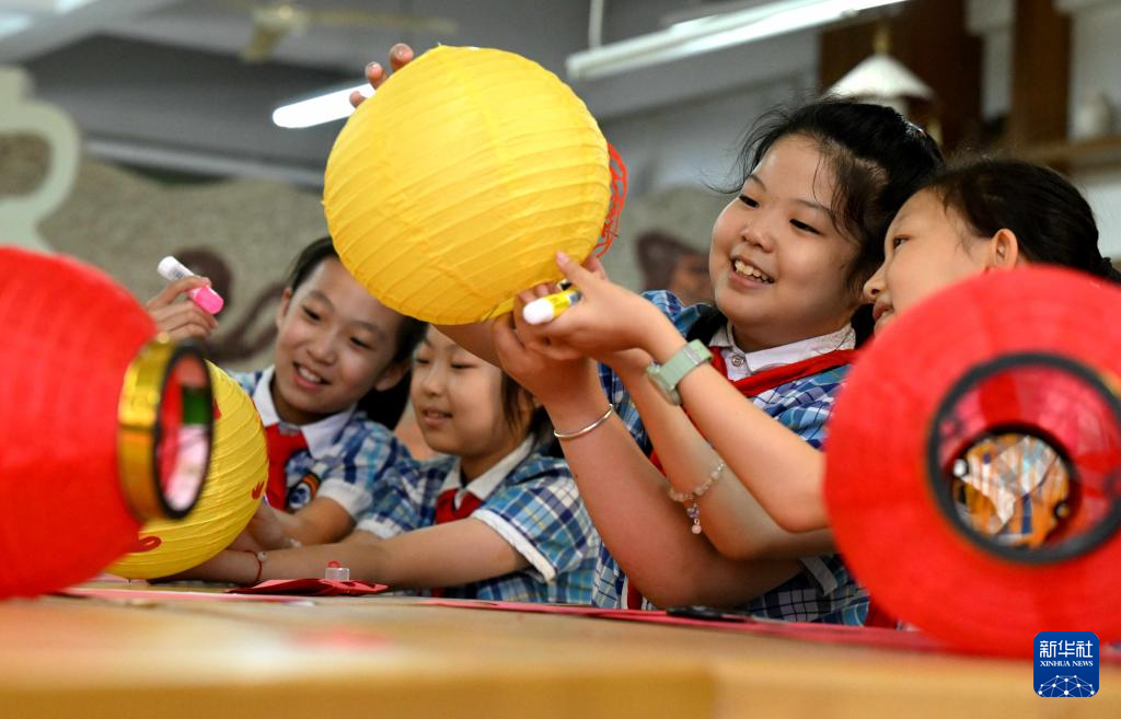 9月11日,在河北省石家庄市桥西外国语小学迎中秋活动中,孩子们在制作花灯。