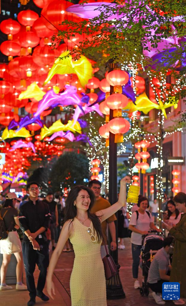 9月17日,人们在香港利东街与大红灯笼合影,欢庆中秋佳节。新华社记者 陈铎 摄