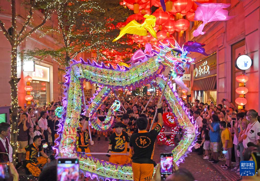 9月17日,人们在香港利东街观看舞龙表演,欢庆中秋佳节。新华社记者 陈铎 摄