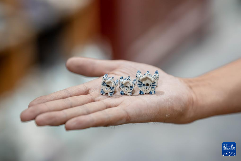 王子强制作的迷你款青花釉瓦猫(9月18日摄)。
