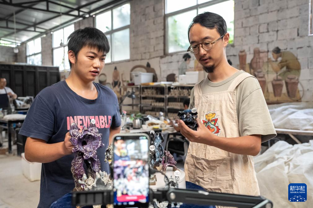 王子强(右)通过网络直播推介瓦猫(9月18日摄)。
