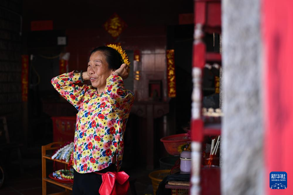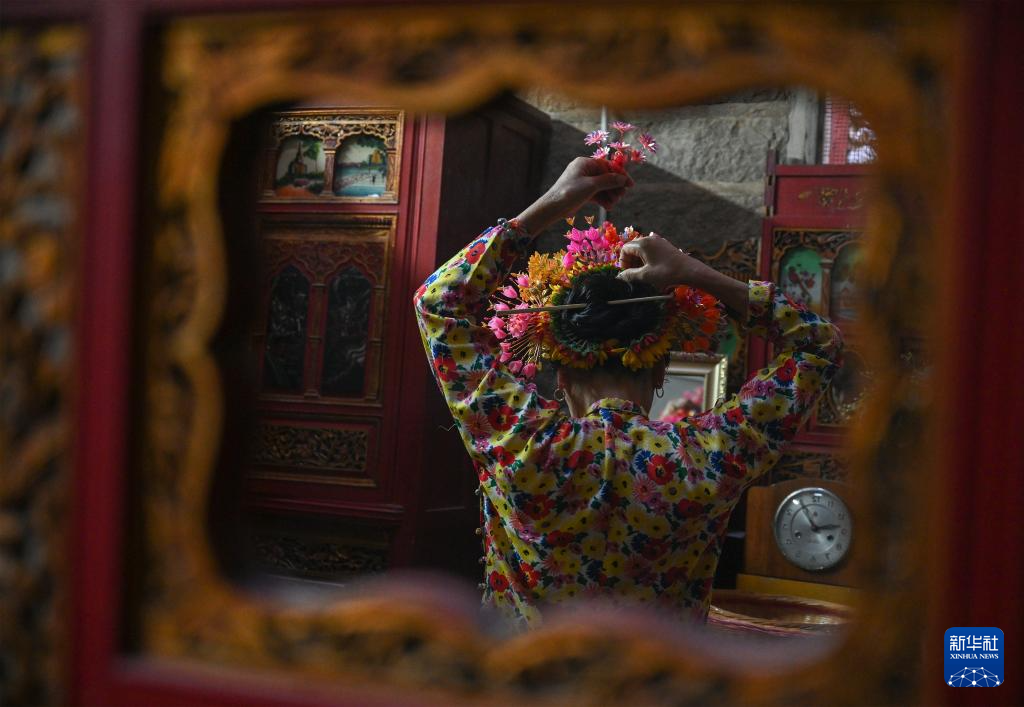 在福建泉州蟳埔村,早起的翁秀珍在给自己“簪花围”(8月28日摄)。