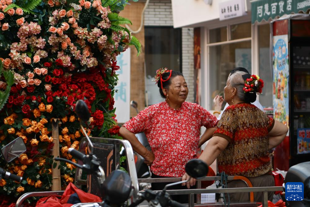在福建泉州蟳埔村,翁秀珍和前来体验“簪花围”的游客合影(8月27日摄)。