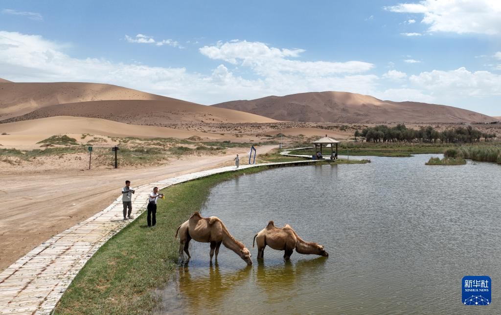 2024年7月31日,游客在巴丹吉林沙漠巴丹湖旁拍摄骆驼(无人机照片)。新华社记者 贝赫 摄