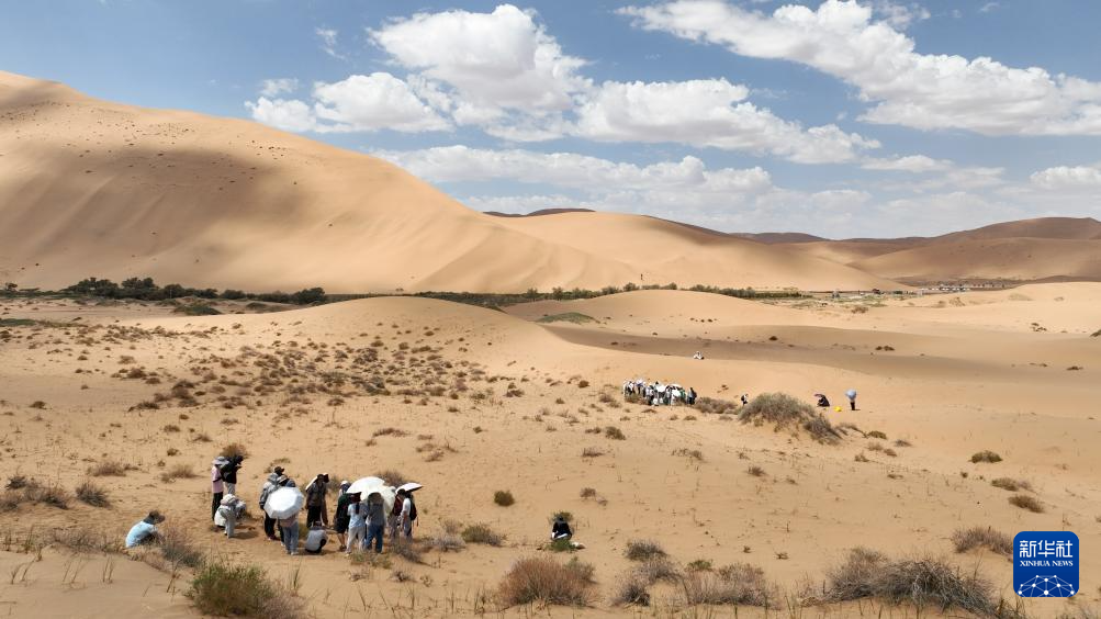 2024年7月31日,来自兰州大学、香港浸会大学、西南大学等18所高校的100余位师生在巴丹吉林沙漠开展“发现计划”地理学联合实习,这是部分师生在巴丹吉林沙漠中开展植被样方调查(无人机照片)。新华社记者 贝赫 摄