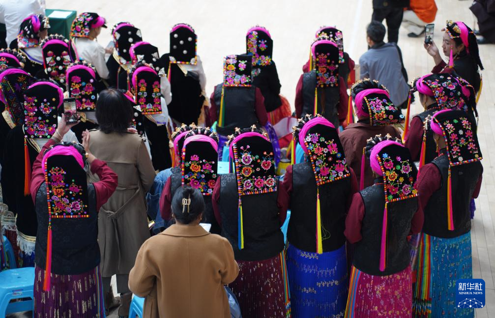 10月11日,佩戴藏族刺绣头帕的妇女在四川省丹巴县县城参加活动。