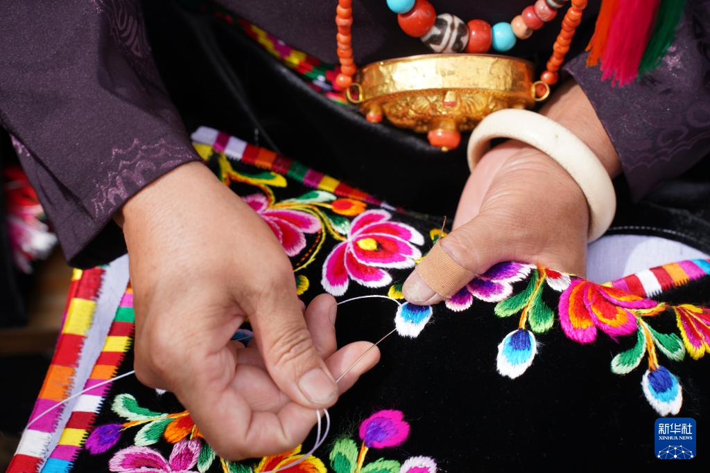 10月12日,嘉绒藏族刺绣甘孜州非遗传承人阿姆在四川省丹巴县巴底镇色足村绣花。