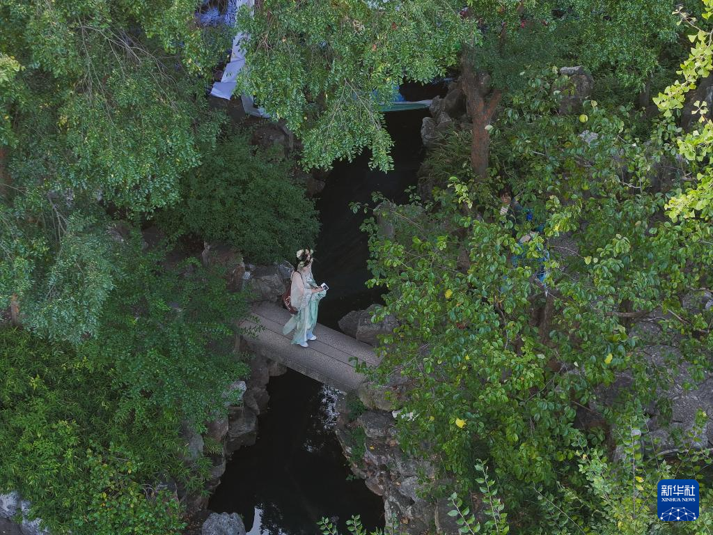 身着古装的游客在留园参观游览(10月23日摄,无人机照片)。