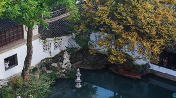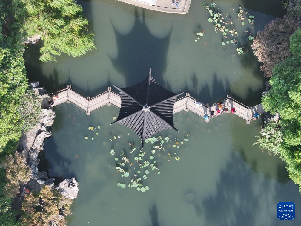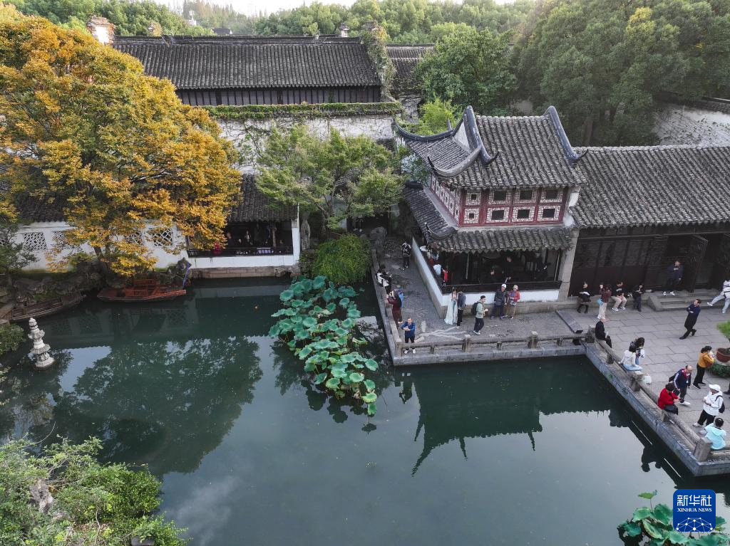游人在拙政园内游览(10月23日摄,无人机照片)。