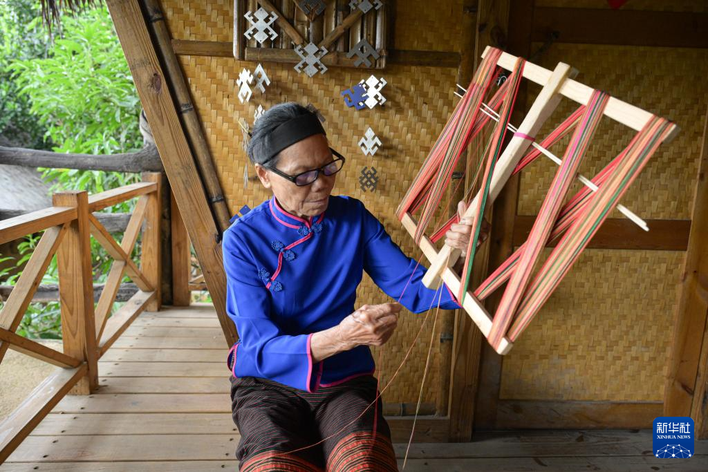 11月4日,黎族老人在位于海南保亭的槟榔谷文化旅游区展示黎族织锦绕线技艺。