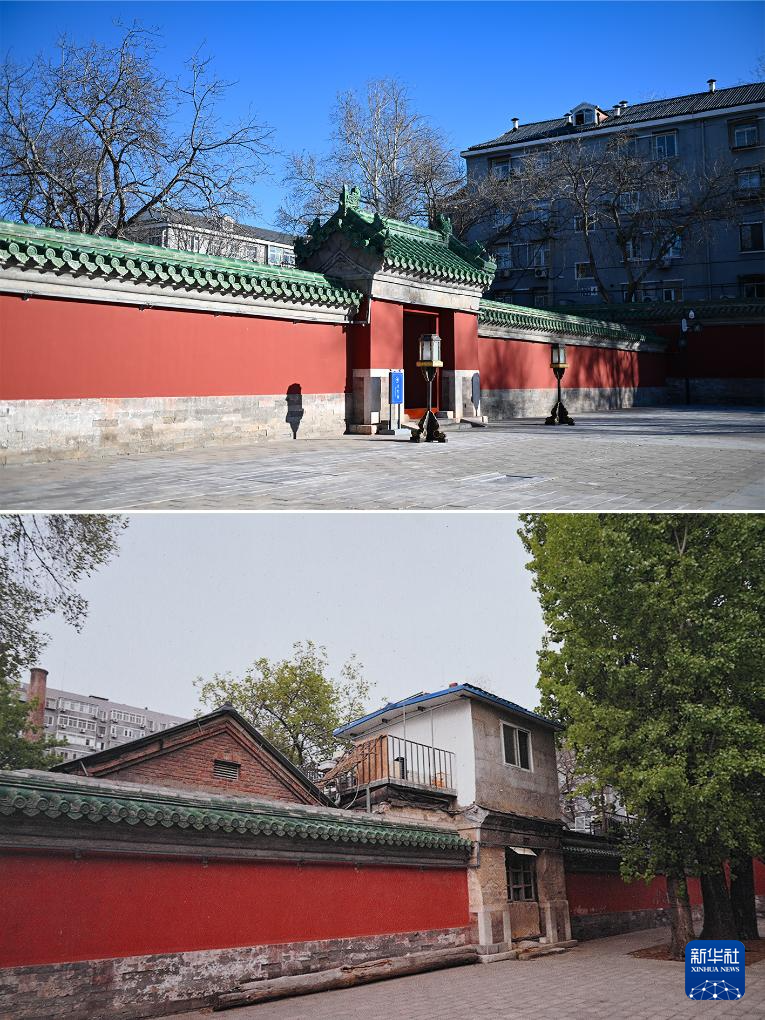 拼版照片:上图为腾退修缮后的庆成宫正殿西侧区域;下图为翻拍的庆成宫正殿西侧区域腾退修缮前的资料照片(12月21日摄)。