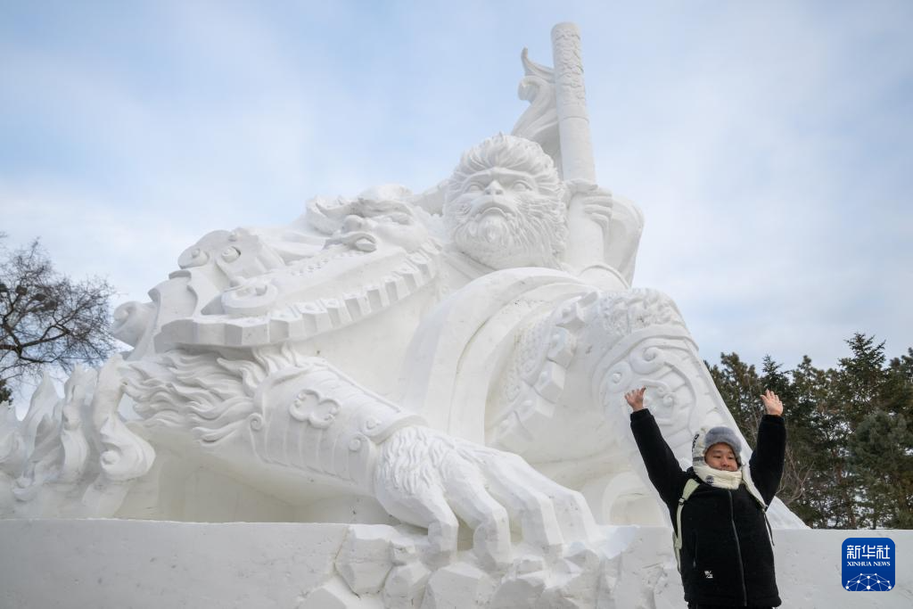 12月23日,一名游客在第37届太阳岛国际雪雕艺术博览会上留影。