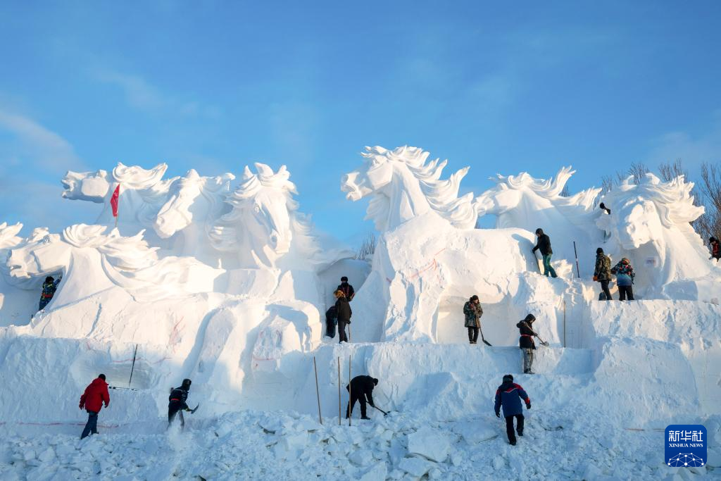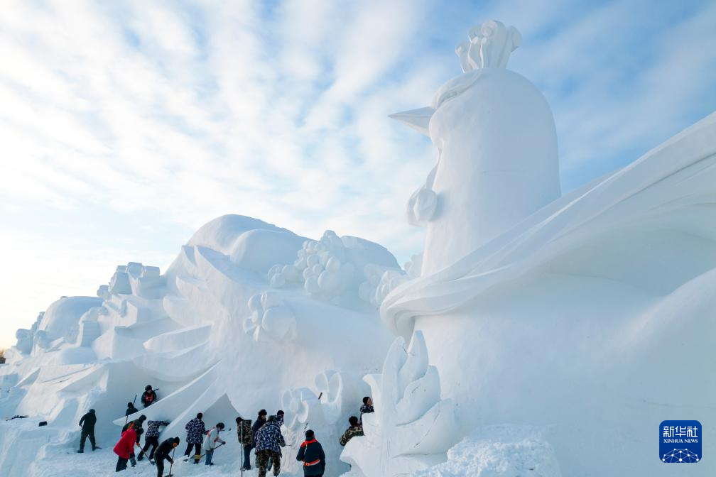 12月23日,雕刻师在哈尔滨太阳岛雪博会园区创作大型雪雕。