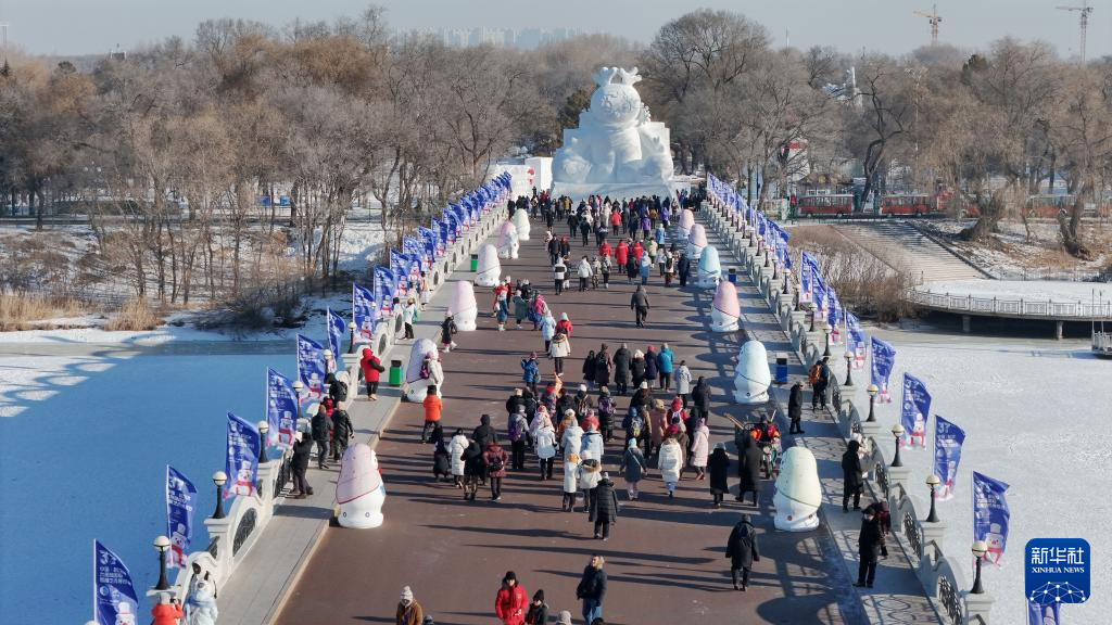 12月23日,人们在第37届太阳岛国际雪雕艺术博览会上游览(无人机照片)。