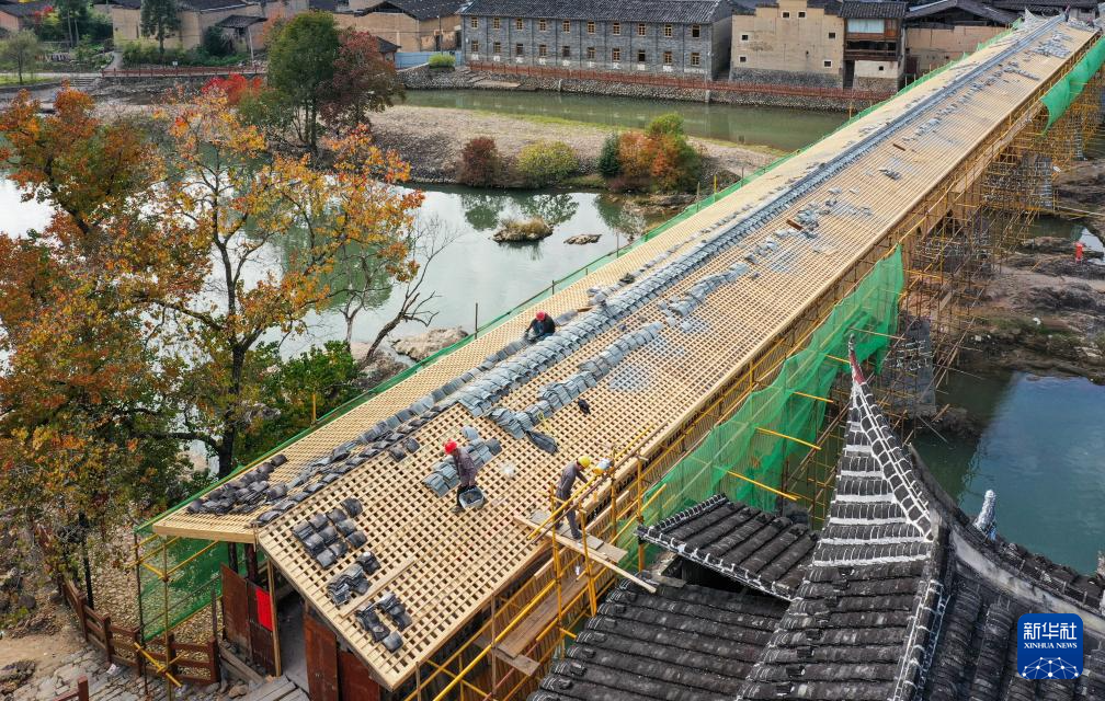 在宁德市屏南县长桥镇,工匠在修复万安桥时铺设瓦片(2023年12月2日摄,无人机照片)。