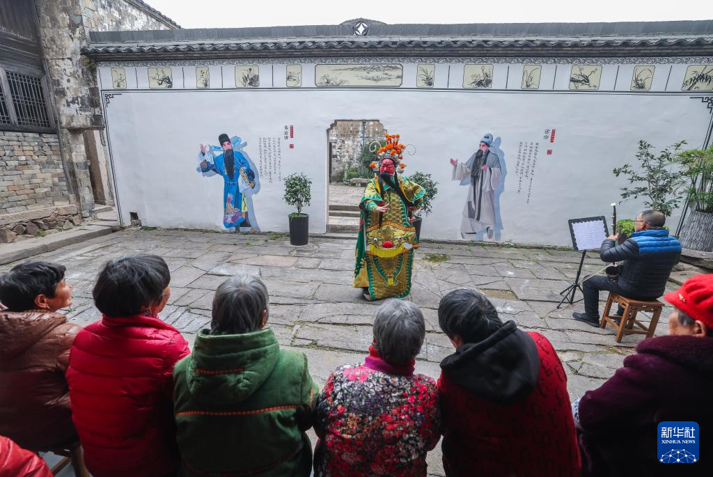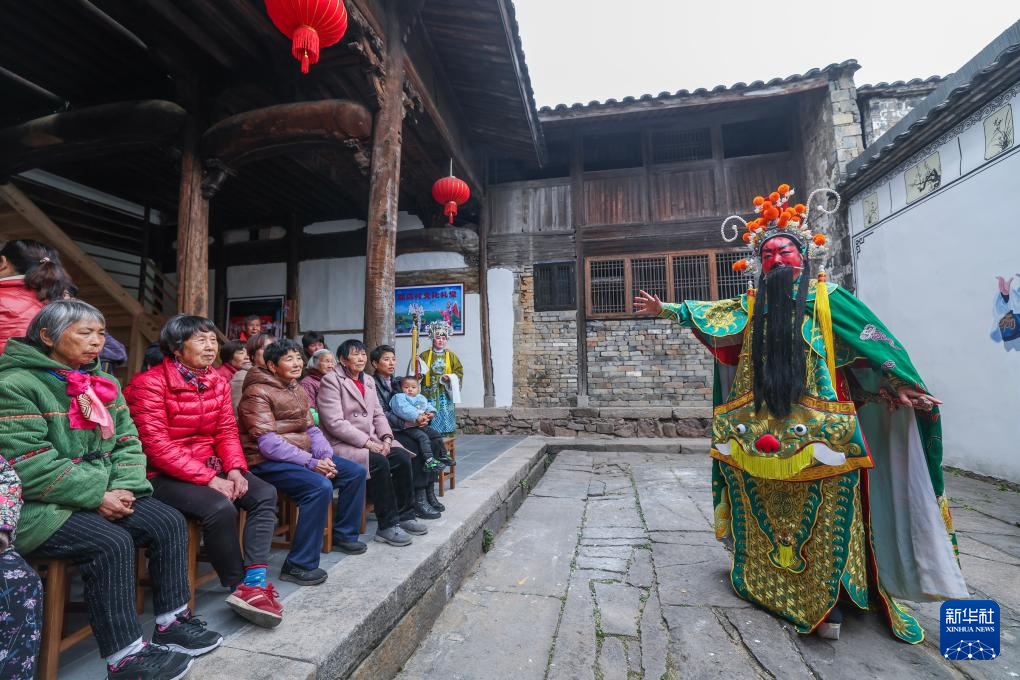 12月25日,郑店村婺剧坐唱班的演员在村文化礼堂为村民们演出婺剧《关羽探营》。