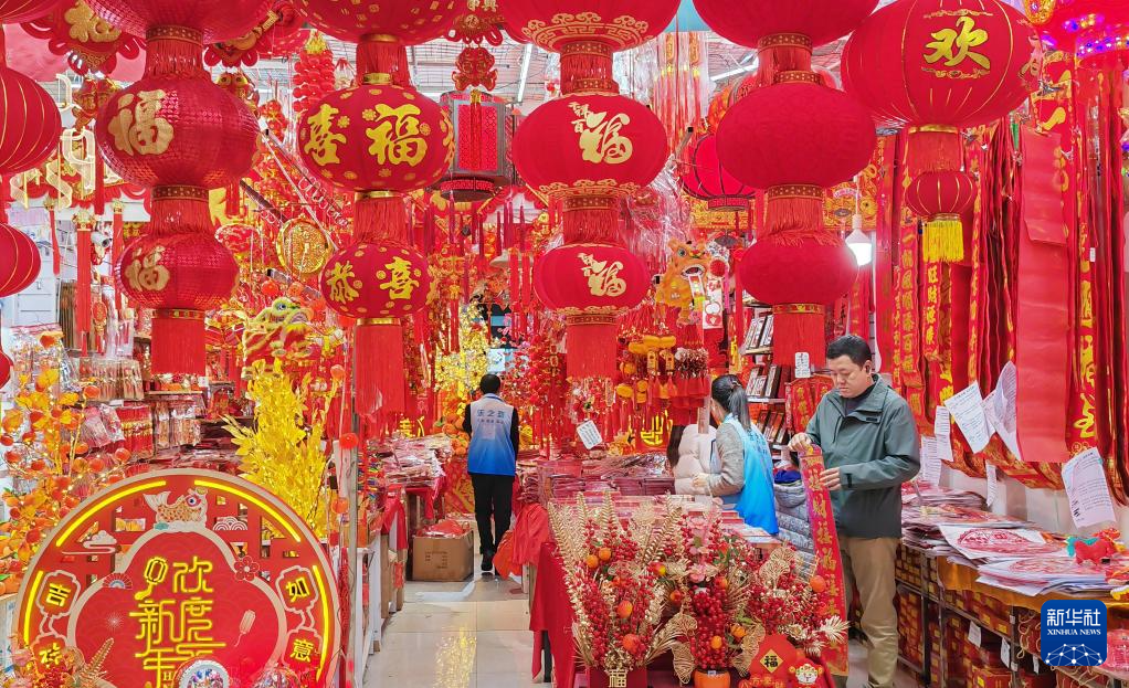 随着农历蛇年临近,广东省深圳市各大年货市场被新年饰品装扮一新,大红灯笼、春联、年画和中国结等春节饰物吸引众多市民前来选购。