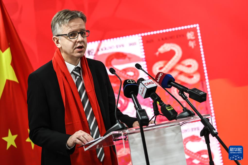 中国驻匈牙利大使馆、匈牙利国家经济部、布达佩斯中国文化中心与匈牙利邮政局21日在匈牙利首都布达佩斯举行中国农历蛇年生肖邮票发行仪式暨中国生肖邮票展开幕式。