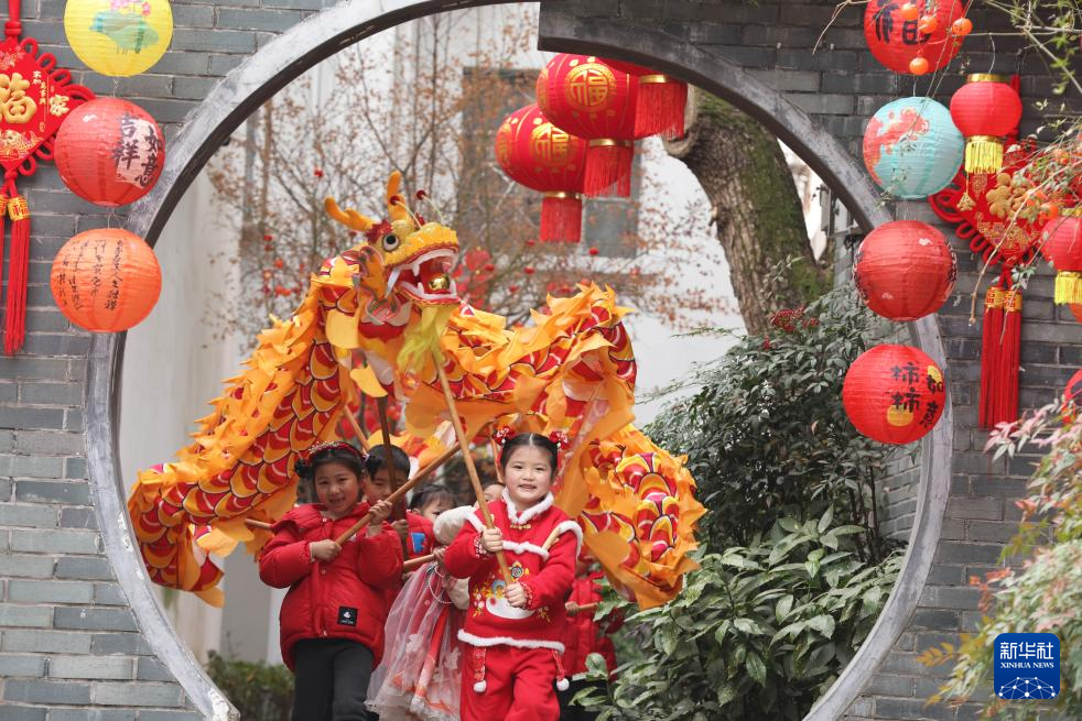 1月23日,在浙江省湖州市德清县乾元镇谈家弄,德清县中心幼儿园小朋友在舞龙。