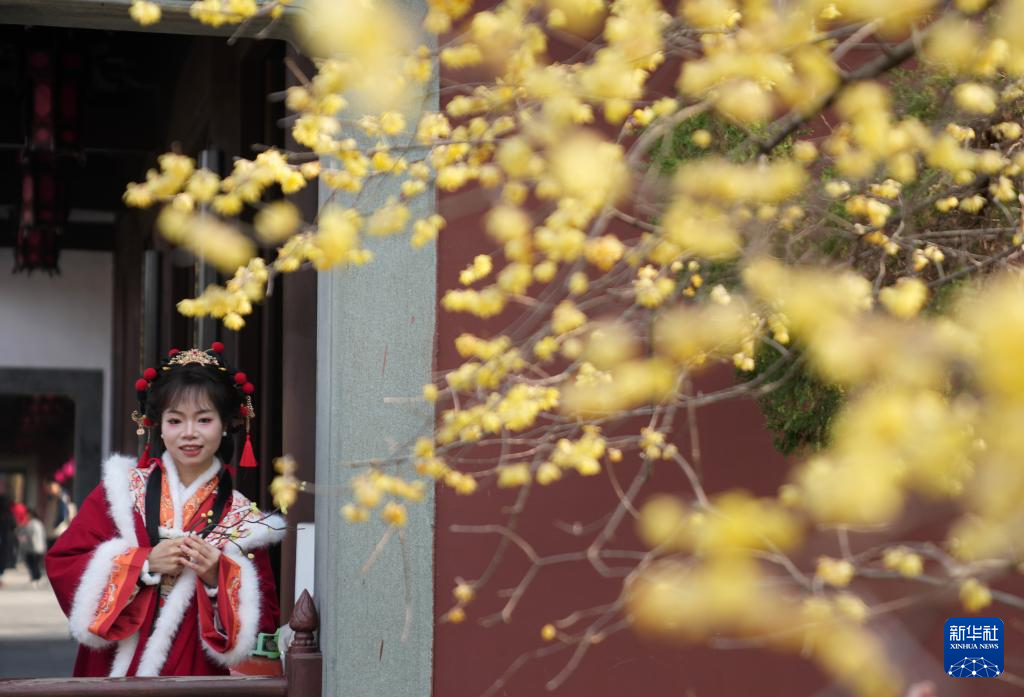 1月23日,人们在杭州钱王祠内观看西湖迎春花展。