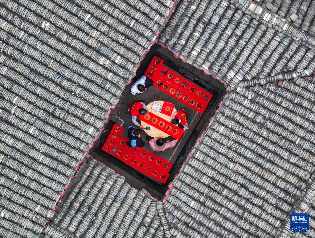 1月22日,湖南省永州市道县梅花镇贵头村,文化志愿者在写春联(无人机照片)。
