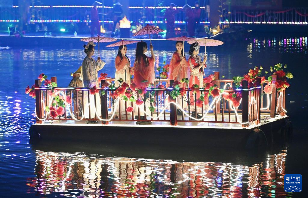 1月22日,演员在山东省滕州市西岗镇九龙湾湿地公园表演花船巡游。
