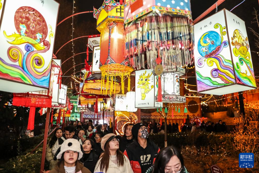 1月22日,游客在甘肃省定西市陇西县北关正街上赏灯游玩。