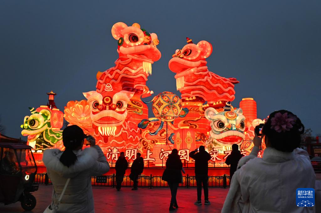 1月23日,游客在河南省开封市清明上河园景区观赏彩灯造型景观。