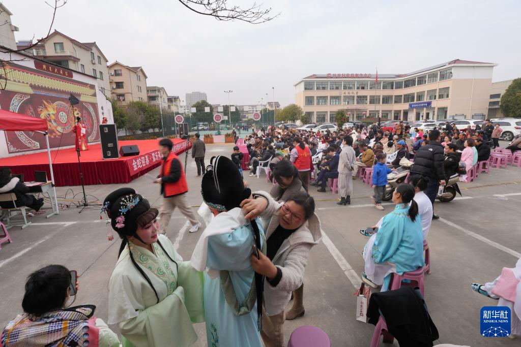 在绍兴市柯桥区夏履镇莲增村,民间越剧团晶蕾艺术团为村民表演越剧《五女拜寿》(1月25日摄)。