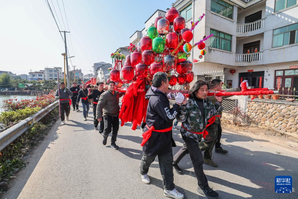 2月10日,赤松镇虎岩村村民抬着板凳龙在村里巡游。