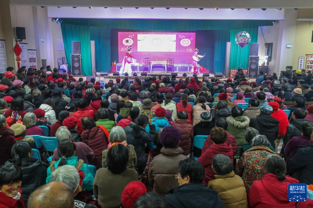 2月15日,大墅镇儒洪村村民们在文化礼堂观看传统戏曲表演。
