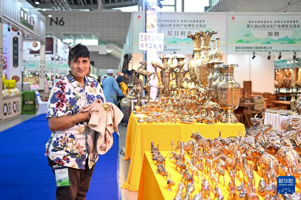8月21日,一位参展商在第七届山西文化产业博览交易会上留影。