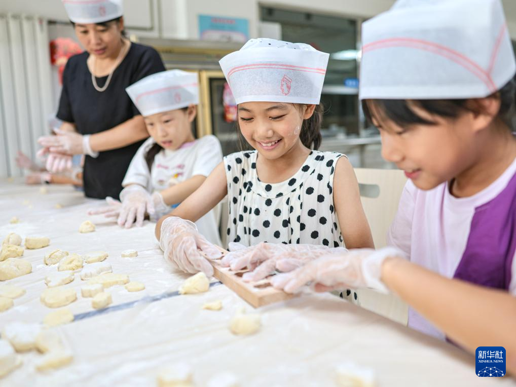 8月26日,在华能山东石岛湾核电有限公司生活区食堂,暑期托管班的孩子制作传统七夕美食巧花。