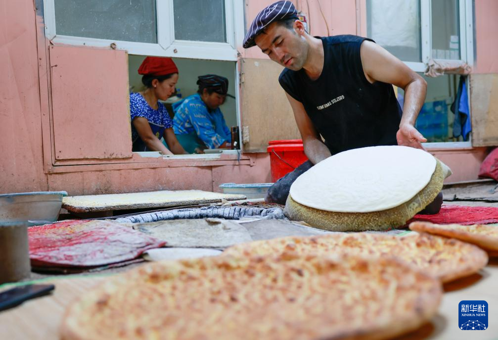 7月22日,在新疆库车市,热西提在自家馕店中打馕。
