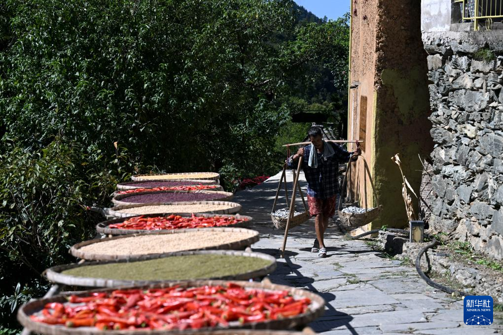 时值秋收时节,村民们利用晴好天气,将辣椒、玉米、山核桃等农作物晾晒在房前屋后,形成独具特色的“晒秋”景观。