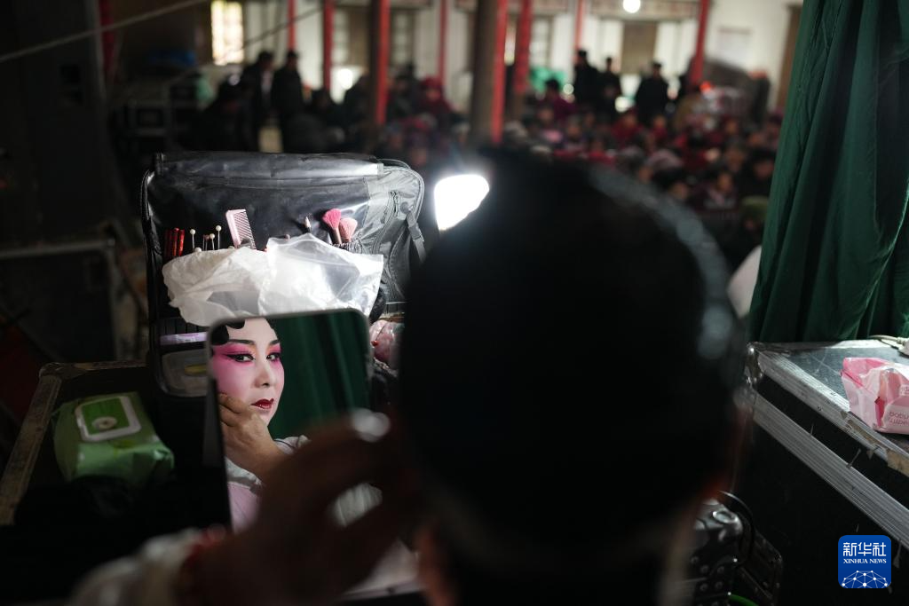1月27日,在金华市婺城区莘畈乡吴村,九州婺剧团的演员在演出前化妆。