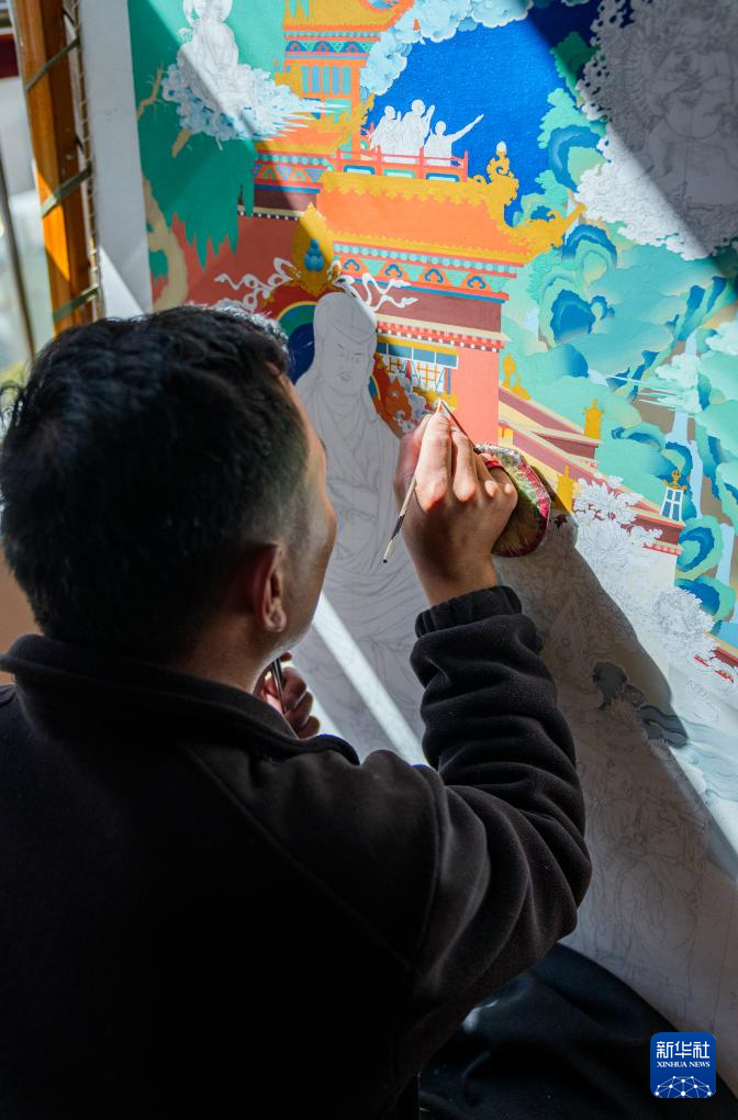 2月10日,罗布斯达在西藏唐卡画院的办公室里画唐卡。