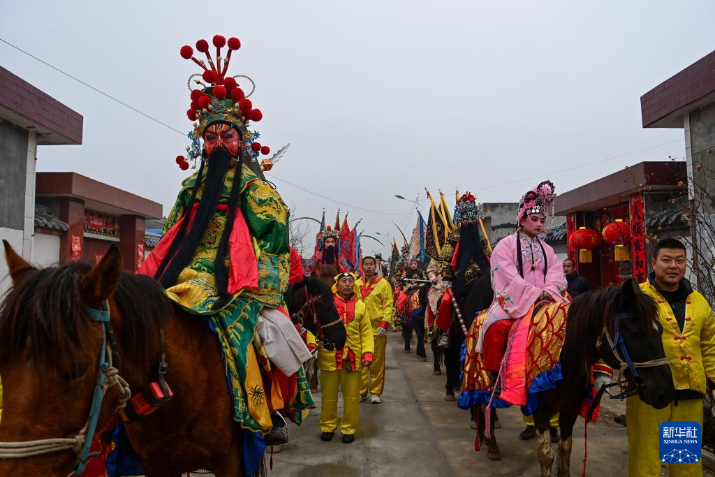 3月2日,陇县黄花峪村村民在家门口迎接社火队。