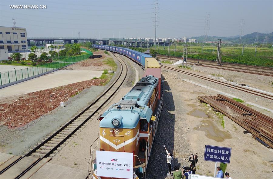The first London-Yiwu cargo train carrying British products arrives at Yiwu West Station in Yiwu, east China's Zhejiang Province, April 29, 2017. London is the 15th European city on an expanding map of destinations for China's rail cargo. The first Chinese freight train arrived in London in January. (Xinhua/Zhang Cheng)