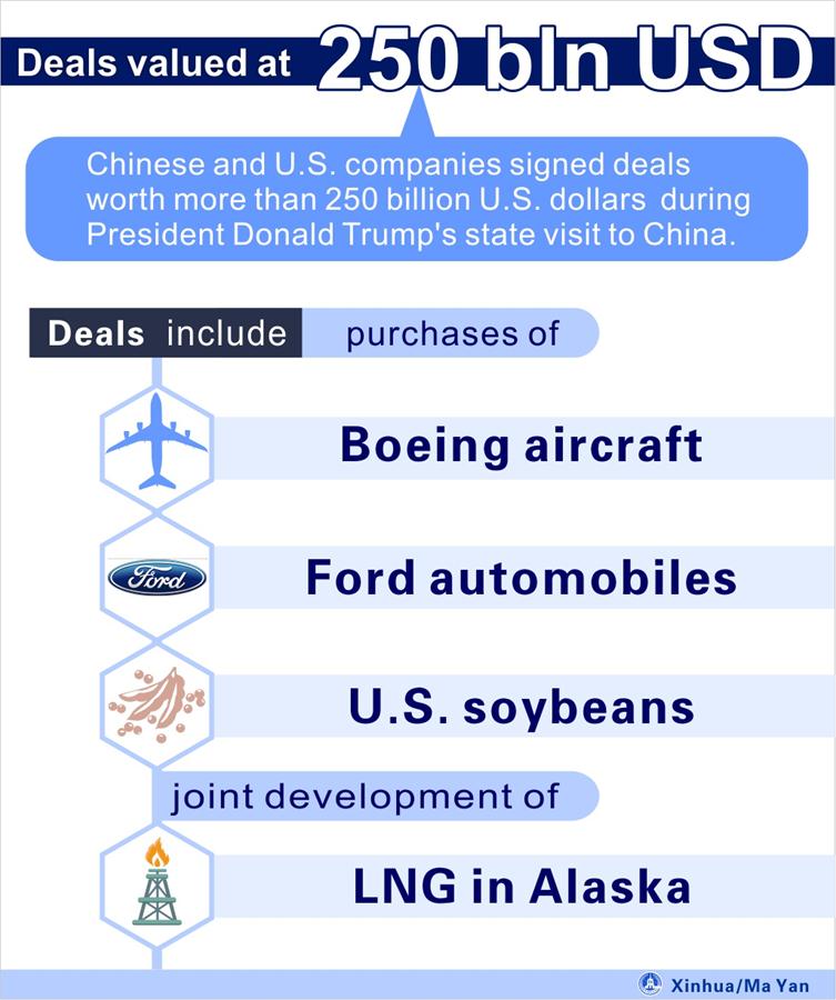 BEIJING, Nov. 9 (Xinhua) -- Chinese and U.S. companies signed deals worth more than 250 billion U.S. dollars during President Donald Trump's state visit to China.