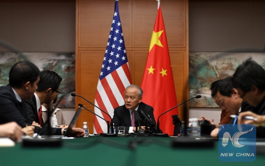 File Photo: Cui Tiankai(C), Chinese ambassador to the United States, gives a press briefing at the Chinese embassy in Washington D.C., the United States, Oct. 30, 2017. (Xinhua/Yin Bogu)