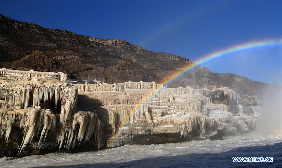 Photo taken on Dec. 17, 2017 shows a rainbow arching over the Hukou Waterfall on the Yellow River in Jixian County, northwest China's Shanxi Province. (Xinhua/Lyu Guiming)