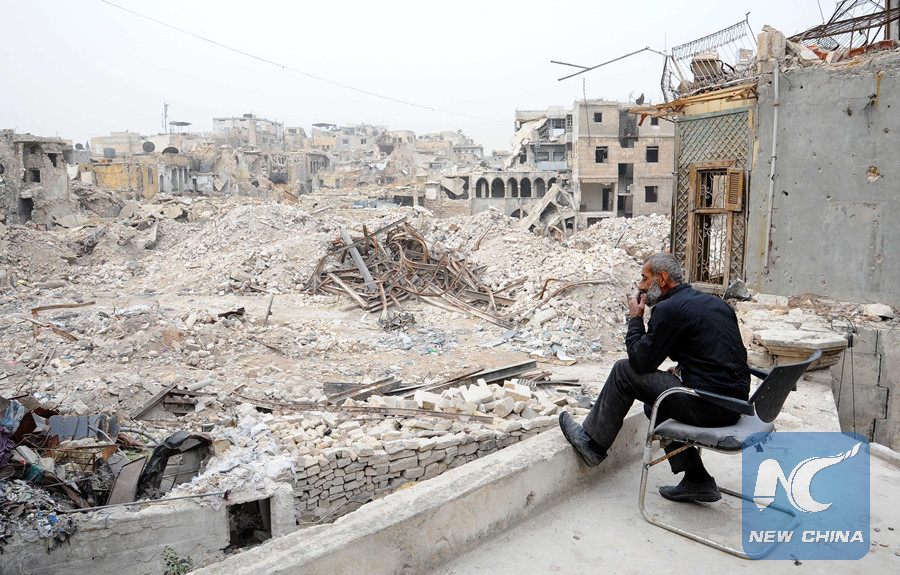 Maher Khayata, a 60-year-old man, sits on the rooftop of a shattered shopping compound in the Old City of Aleppo, northern Syria, on Dec. 21, 2017. (Xinhua/Ammar Safarjalani)