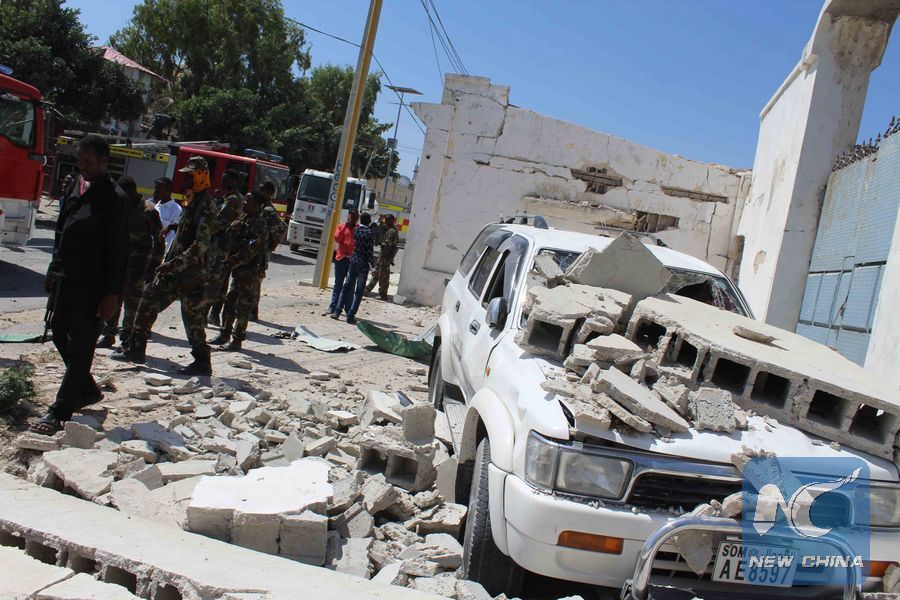File photo taken on Jan. 2, 2017 shows the scene of a suicide attack in Mogadishu, capital of Somalia. At least two people were killed and several others injured in the attack by extremist group Al-Shabaab near the base of the African Union Mission in Somalia (AMISOM) and a luxury hotel in the Somali capital Mogadishu. (Xinhua/Faisal Isse)