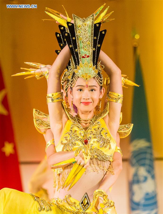 Artists of China Disabled People's Performing Art Troupe perform thousand-hand Bodhisattva at Palais des Nations in Geneva, Switzerland, Aug. 31, 2017. A group of Chinese artists with disabilities on Thursday night gave a breath-taking show in the Palais des Nations, the UN headquarters in Geneva, to more than 1,000 audiences, including over 30 ambassadors and senior international organization leaders. (Xinhua/Xu Jinquan)
