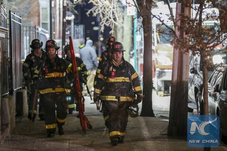 Firefighters walk at the site of an apartment fire in Bronx, New York, the United States, Dec. 29, 2017. (Xinhua/Wang Ying)
