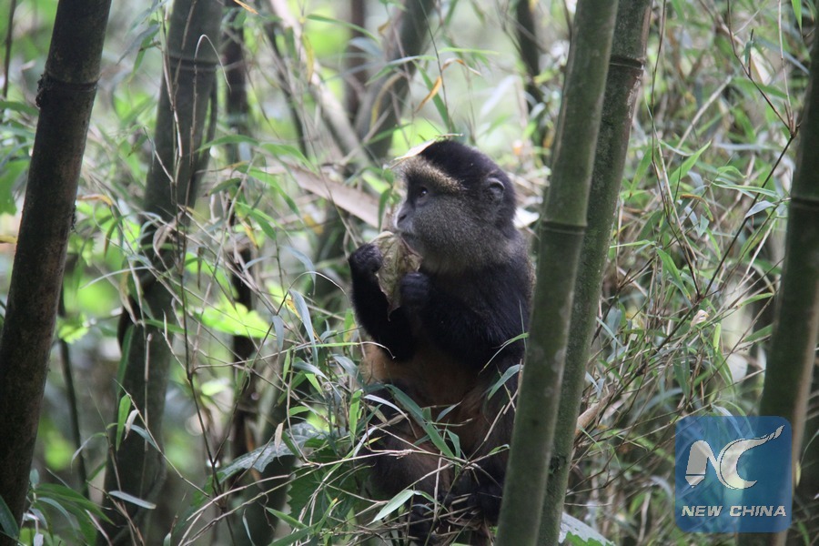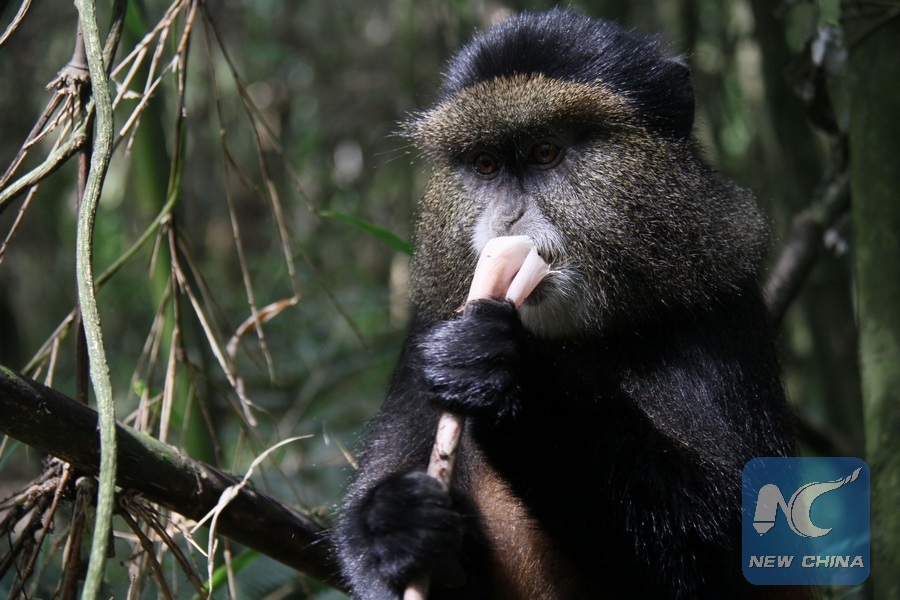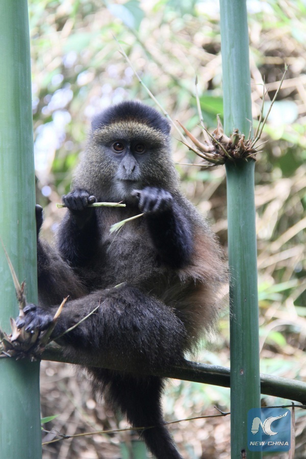 A golden monkey eats bamboo in Volcanoes National Park, northwestern Rwanda, on Dec. 25, 2017. (Xinhua/Lyu Tianran)
